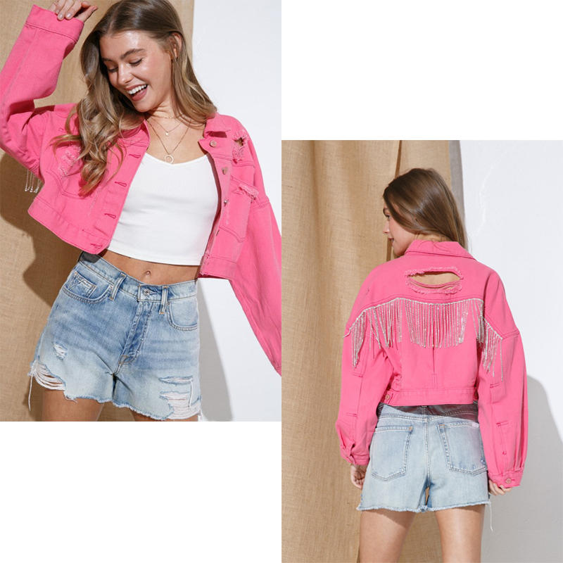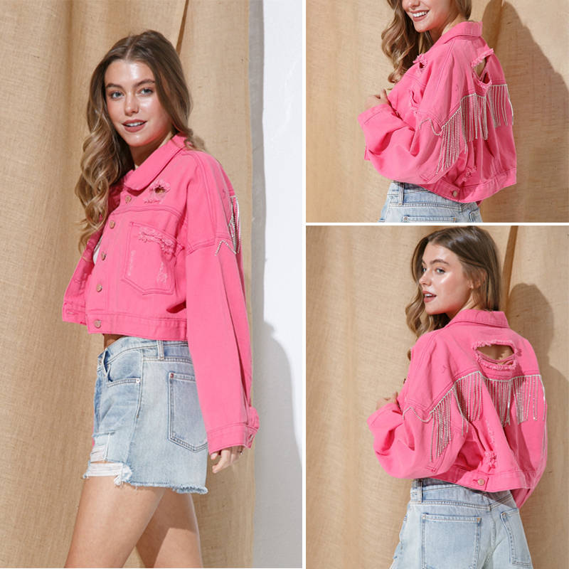Womens Denim Jacket with Fringe Rhinestones Crop Casual Coat-RoseRed