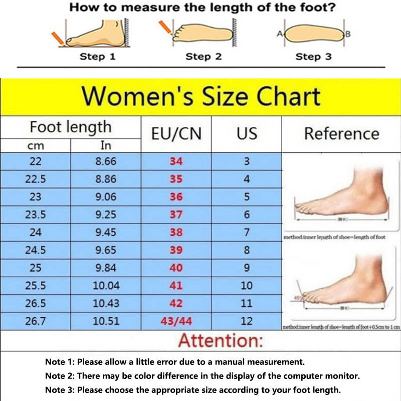 - Please refer to the shoe size chart in the picture before buying shoes to get the correct size. Since the dimensions are manually measured, there may be some errors. Please measure the length of your feet to get the best fit. Due to the different display and lighting effects of the monitor, the picture may not reflect the actual color.