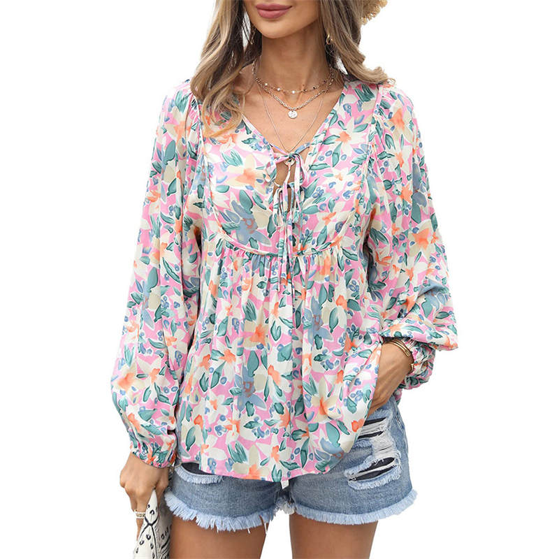 Womens Floral Ruffled Tunic Blouse Tie V Neck Casual Long Sleeve-Pink