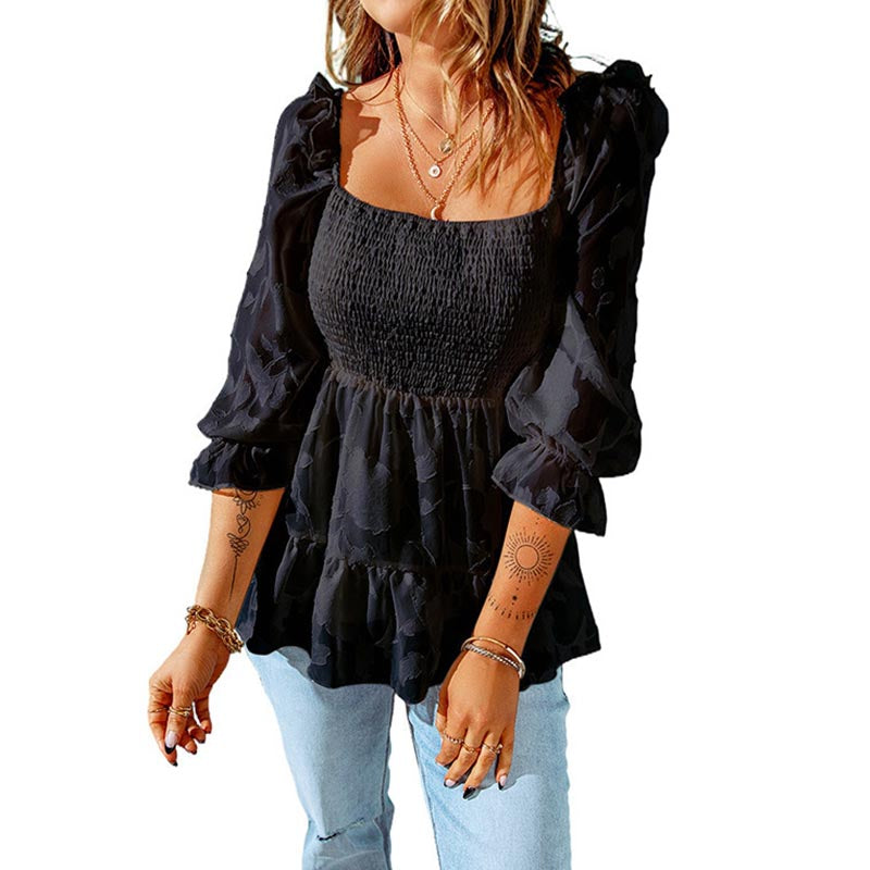 Womens Floral Textured Square Neck Ruffle 3/4 Sleeve Peplum Top Blouse-Black