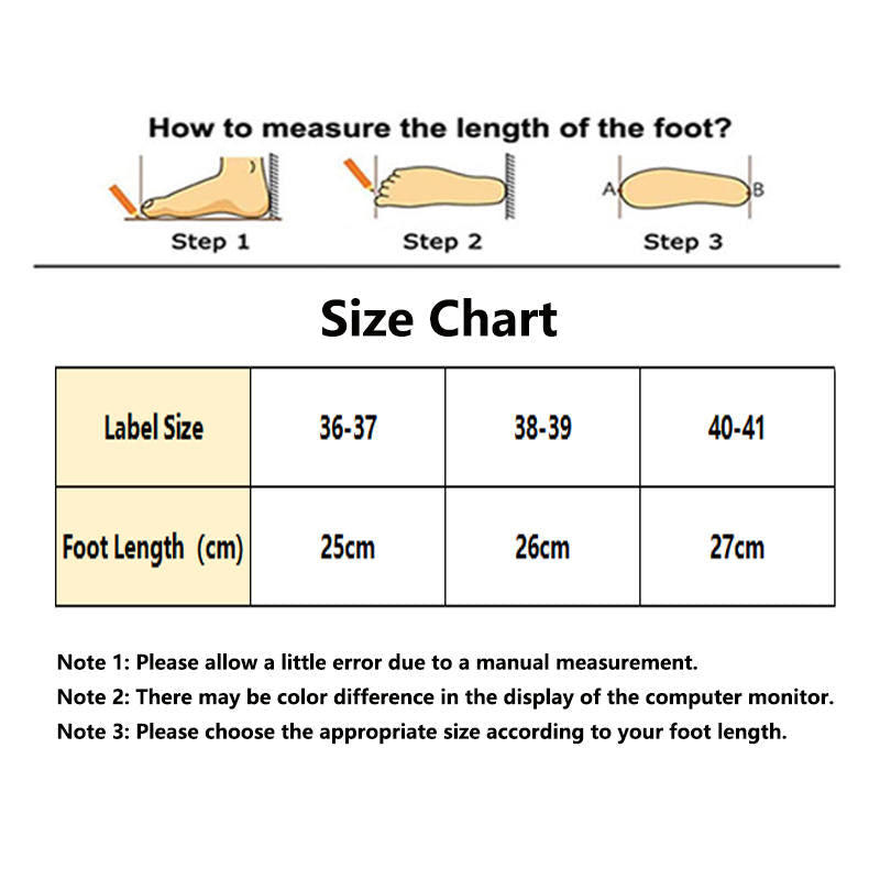 - Please refer to the shoe size chart in the picture before buying shoes to get the correct size. Since the dimensions are manually measured, there may be some errors. Please measure the length of your feet to get the best fit. Due to the different display and lighting effects of the monitor, the picture may not reflect the actual color.