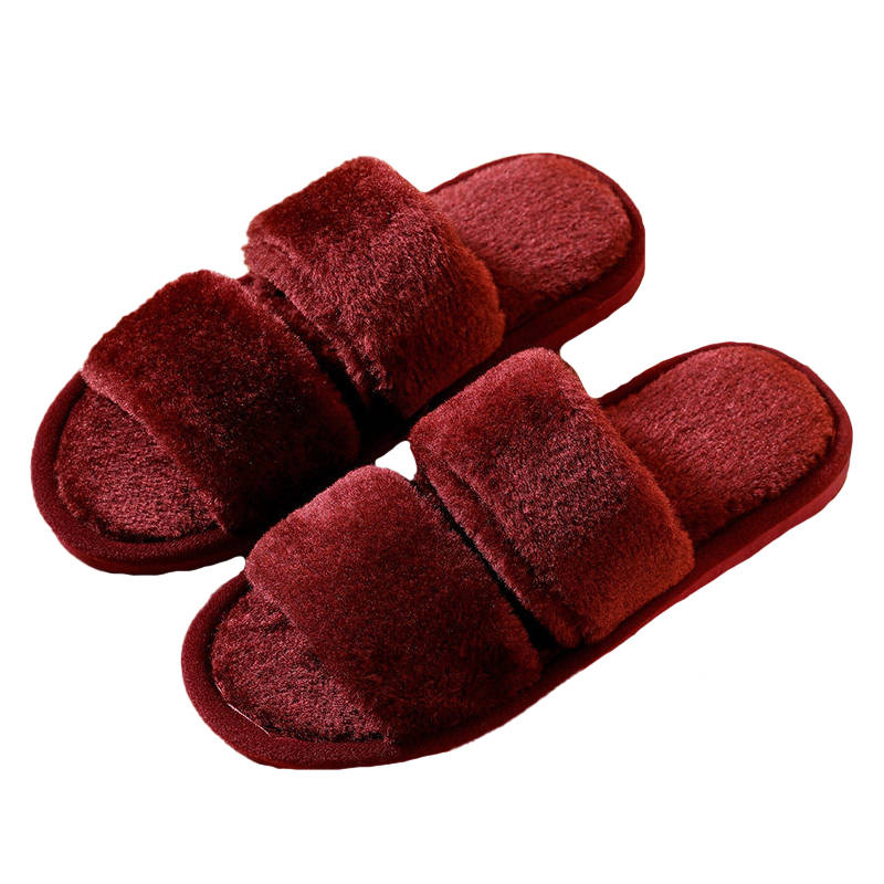 Womens Fuzzy Slippers Open Toe Cozy Memory Foam Sandals-Parallel Wine Red