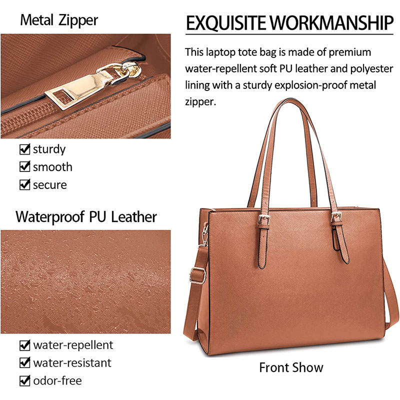 - Classy & Professional Laptop Women Bag: Made of durable and premium water-repellent scratch-resistant soft PU leather and polyester lining. Metal feet base protects your bag from damage. The laptop bag is perfectly poised and beautiful style anywhere you go, the simple lines and solid colors make this large business tote bag is a classical piece.