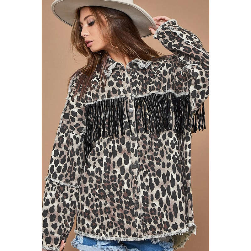 Womens Leopard Print Jacket Button Down Fringe Vintage Denim Coat