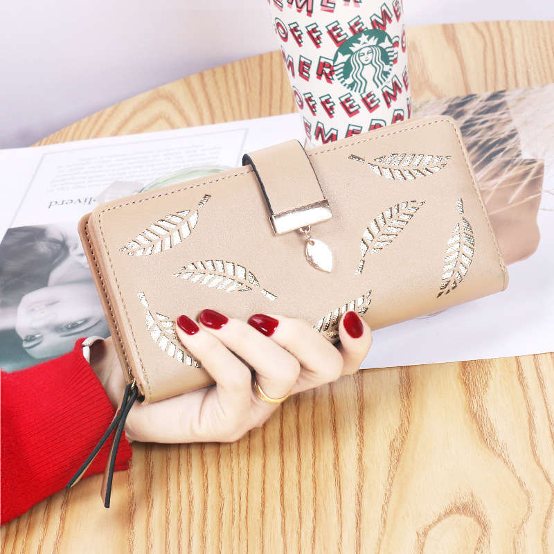 Womens Long Leaf Bifold Wallet Leather Zipper Buckle Elegant Clutch-Khaki