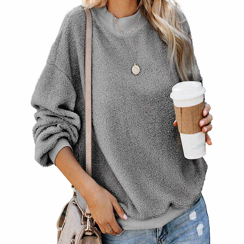 Womens Plush Sweater Casual Round Neck Sweatshirt Pullover-Gray