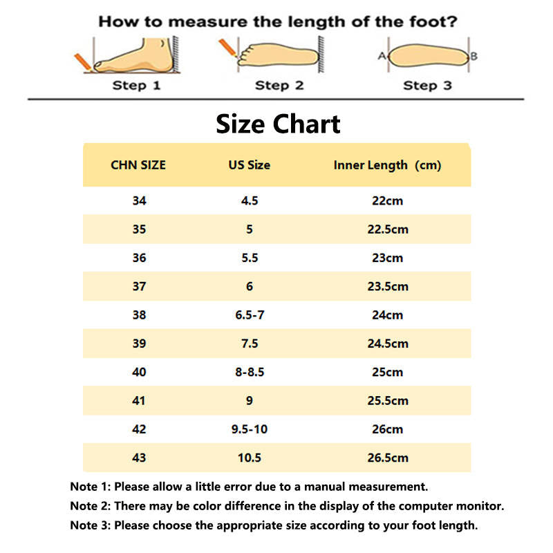 - Please refer to the shoe size chart in the picture before buying shoes to get the correct size. Since the dimensions are manually measured, there may be some errors. Please measure the length of your feet for the best fit. Due to the different display and lighting effects of the monitor, the picture may not reflect the actual color.