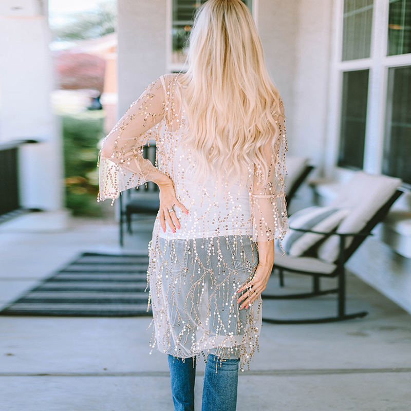 - See-through long sleeve cardigan embellished with sequins, be made of breathable fabric, fit well keep cozy and looks bling bling. This cover up is a wonderful option for modern ladies, a versatile piece without any restrictive condition.