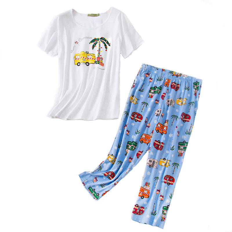 Womens Short Sleeve Casual Prints Pajama Cropped Trousers Set-Blue Coconut Car