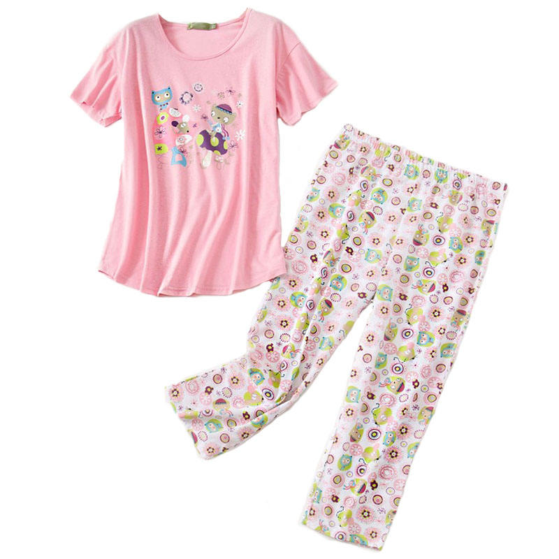 Womens Short Sleeve Casual Prints Pajama Cropped Trousers Set-Pink Flower Mouse