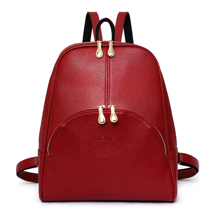 Womens Soild Backpack PU Leather Zipper Casual Travel Bags-WineRed
