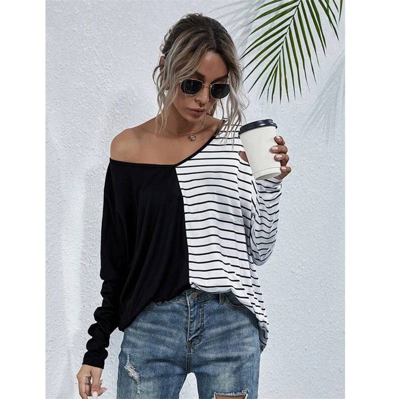 Womens Striped V-Neck Long Sleeve Tops-Black