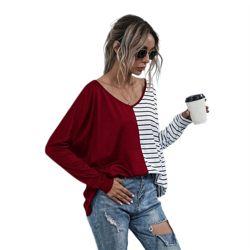 Womens Striped V-Neck Long Sleeve Tops-Red