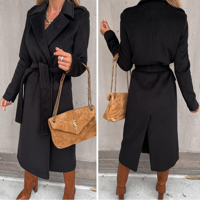 Womens Trench Coats Lapel with Tie Belt Fashion Winter Long Outwear-Black