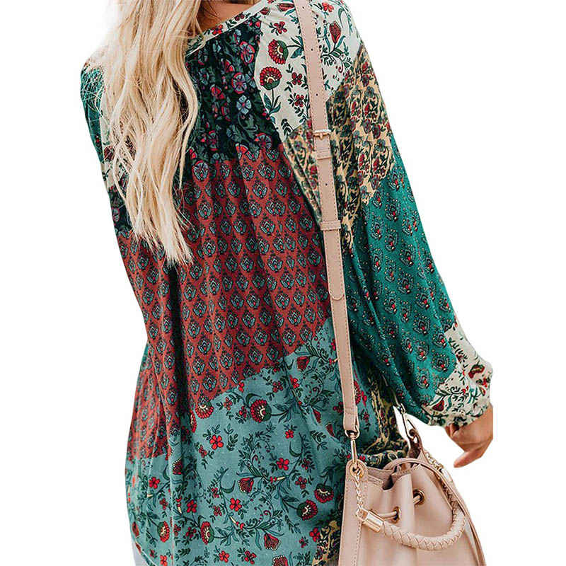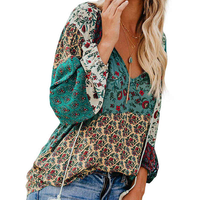 Womens V-neck Casual Boho Floral Print Long Sleeve Shirts-Green