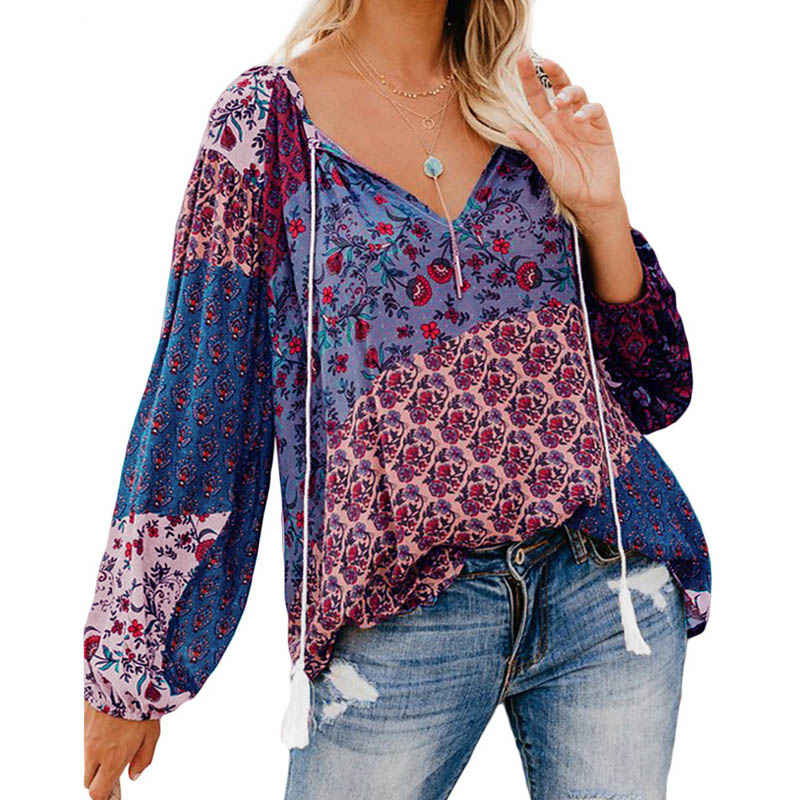 Womens V-neck Casual Boho Floral Print Long Sleeve Shirts-Purple