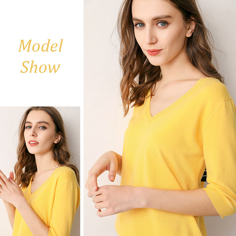 Womens V Neck Sweaters Soft Tops Knit Casual Solid Pullover-Yellow